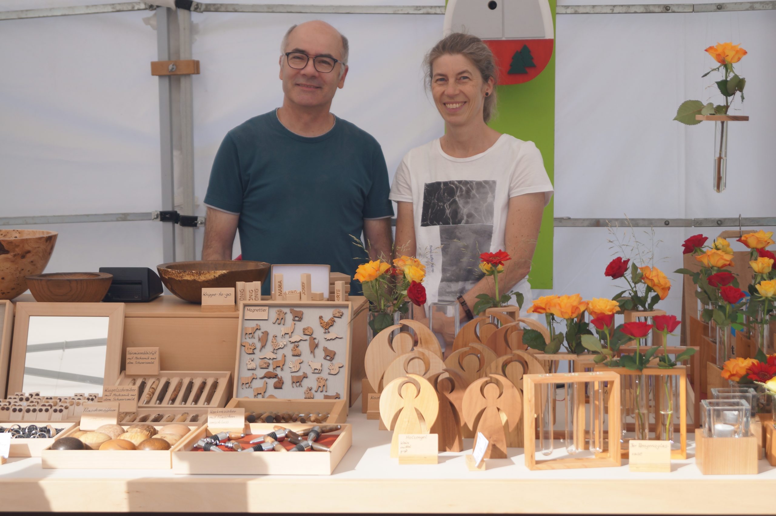 Wir stellen kunsthandwerkliche Produkte und Schmuck aus heimischen Hölzern her, die wir auf Märkten verkaufen. Dort kann man uns auch zusehen, wie auf der Drechselbank beispielsweise Kreisel gefertigt werden.
